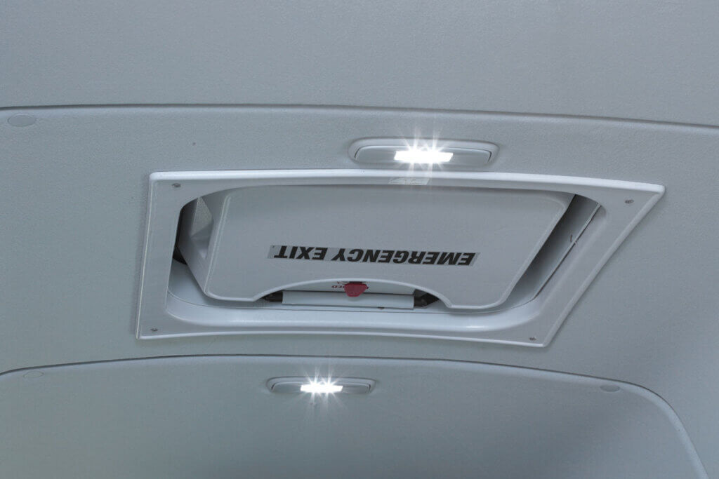 Our bus door package features a 33" wide by 76" tall doorway, providing safe, reliable entry for passengers. The design includes built-in LED-lighted steps and entryway stanchion poles to enhance visibility and support during boarding and exiting.